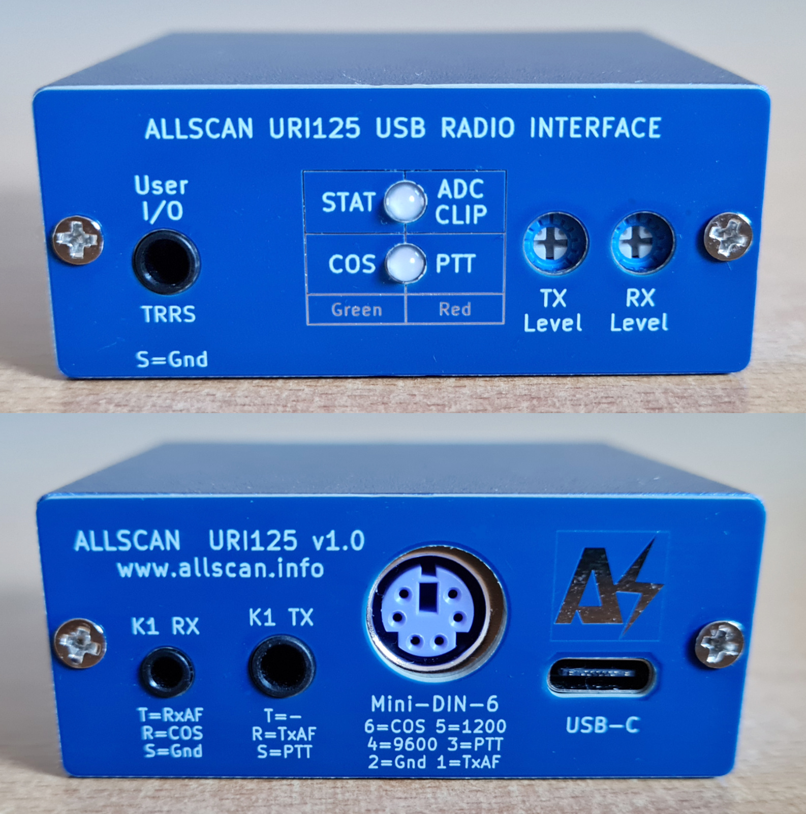 AllScan URIs provide outstanding audio quality, RFI-rejection and cost-effectiveness, and support AllStar, EchoLink, VARA FM, Winlink, DigiPi, APRS, DireWolf, FT8, other PTT/data communications applications and interfacing of Win/Mac/Linux PCs and Smartphones to HTs, portable and mobile radios for use with remote rig control, digital modes, packet radio, etc. Comprehensive LEDs show USB host Status, COS, ADC Clip, and PTT state. HTs connect with standard K1 2.5mm & 3.5mm TRS cables, the URI125 and URI201 have a Mini-DIN-6 jack, and the URI201 provides a DB9 jack. AllScan URI Configuration Settings