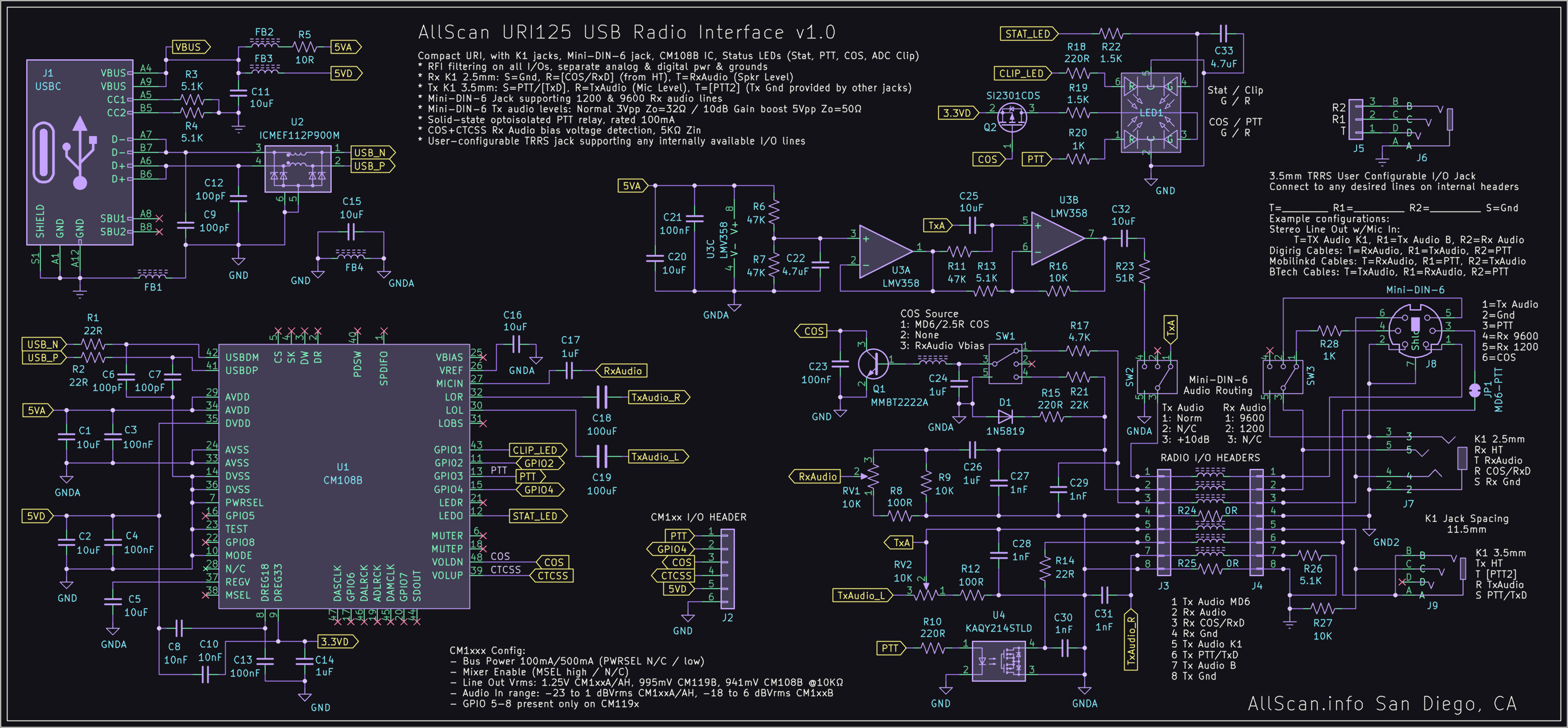 The URI125 replaces both the URI101 and URI110 - combining all functions of both while adding several additional new features including a User-configurable 3.5mm TRRS I/O jack, switch-selectable 10dB gain Tx audio amp, optocoupled solid-state PTT relay, and switch-configurable Mini-DIN-6 jack supporting simultaneous use of the Mini-DIN and K1 jacks for separate Rx and Tx radios/connectors. There is no higher-performance, lower-cost URI that supports both HTs and mobile radios.Schematic / What's in the Box