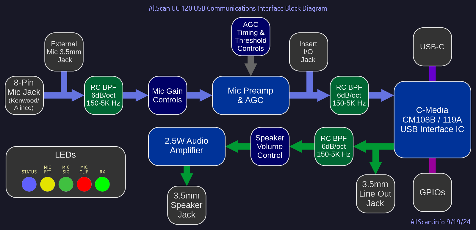 The AllScan UCI120 USB Communications Interface is a professional-grade yet low cost USB Audio/PTT communications interface that sets a new standard for AllStar, EchoLink and other PTT communications applications. The UCI120 replaces the ANR100-A Radio-less Node Audio Module, putting all parts on one PCB, adding more status LEDs, making the mic gain controls and Line Out jack standard features, and adding additional interior controls to fine-tune audio and mic AGC parameters. The UCI120 is designed and optimized for use with communications microphones, speakers and other audio equipment, and is not intended to interface to radio transmitters or receivers.
