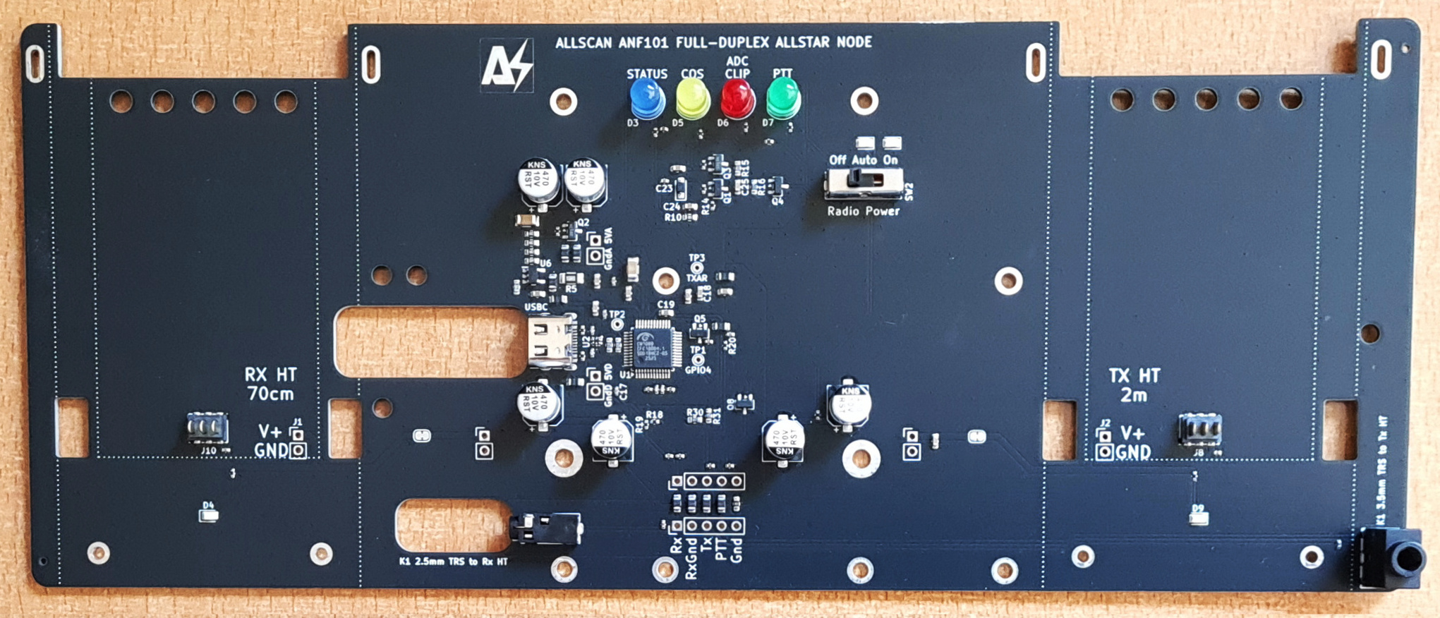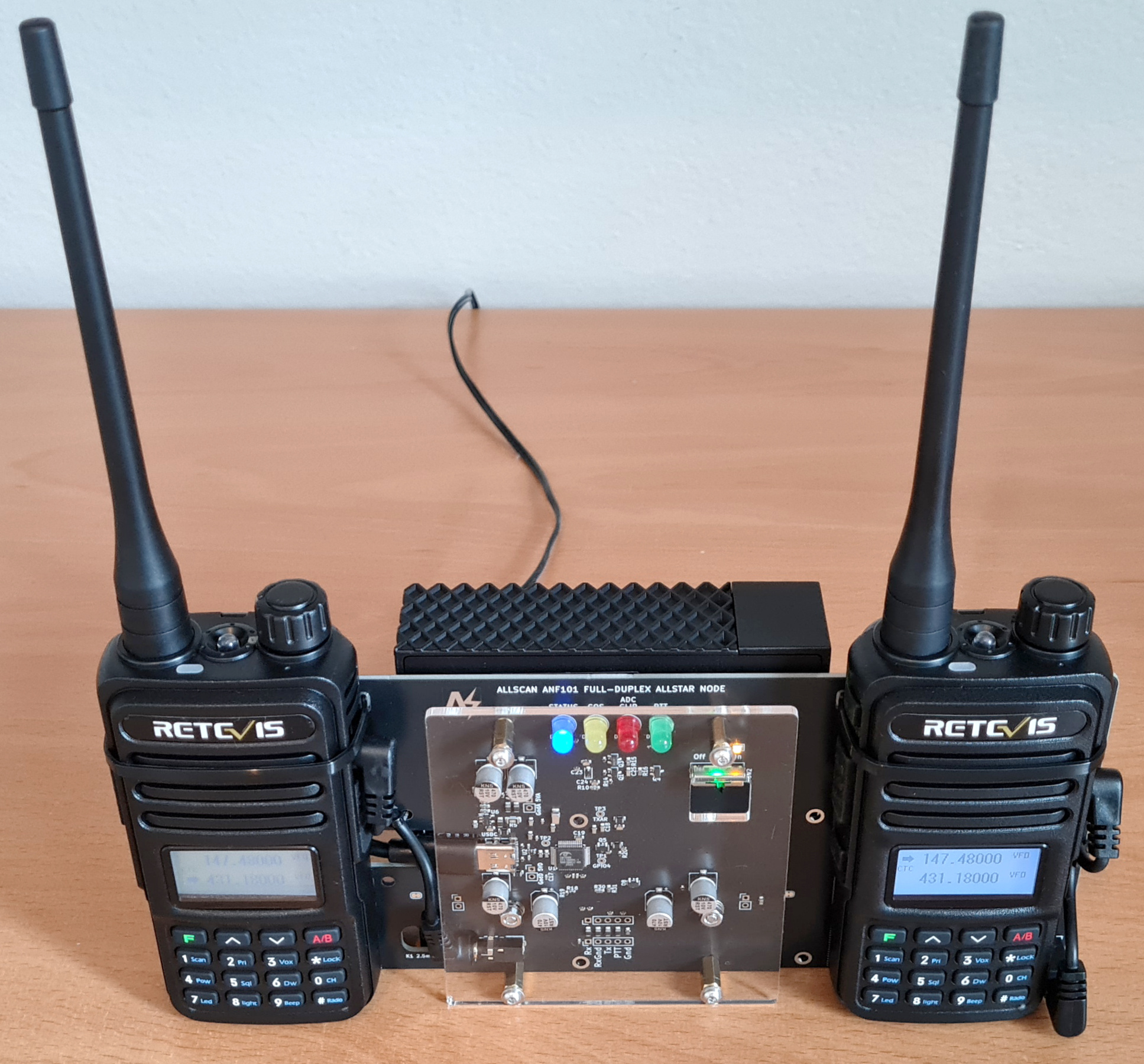 After months of research and testing starting in 2022 I developed the ANF101 design which is the most cost-effective, highest-performance full-duplex radio-based node available, using widely available FCC-certified components. This has for the first time enabled cross-band full-duplex nodes to be built that have excellent audio quality and RF performance, with a full-featured MiniPC, USB Radio Interface (URI), and node radios for under $200 in materials costs. The ANF101 design fully and properly supports 2.5 Watts Tx power, 55+dB audio Signal-to-Noise Ratio (SNR), Squelch-Tail Elimination (STE), CTCSS and DCS tone squelch, simple front-panel radio configuration, 5-14VDC or 100-240VAC operation with a single power cord/adapter, and can be assembled in less than half an hour with off-the-shelf components and no soldering or custom cabling.