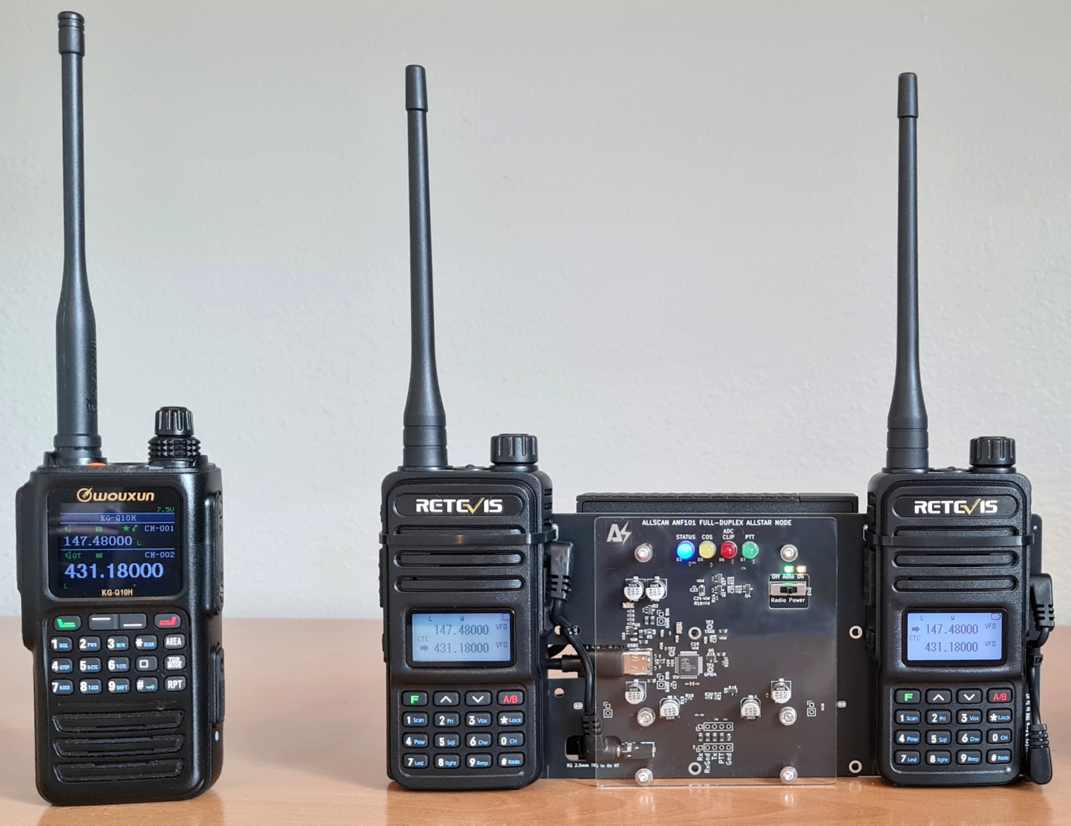 Radios you use to talk into the node ("client" radios) should support Cross-Band Full-Duplex. Vintage HTs such as the Yaesu FT-470, FT-530, FT-51R, Kenwood TH-D72A, Icom IC-W32A, Alinco DJ-G5 and DJ-G7 support cross-band full-duplex, but due to their age they can be a hassle to use and maintain, and they do not always have the best audio quality. Fortunately, Wouxun makes at least 4 HT models that support Cross-Band Full-Duplex extremely well, and work much better than any vintage HT (I have tested them all extensively - see my youtube videos). I highly recommend the Wouxun KG-Q10H, KG-935H, KG-UV9D Plus and the KG-UV8D Plus. These have great audio quality and work similarly to a high-quality full-duplex speakerphone - when keyed up you talk into the HT like you would with any other HT, but the HT will also be receiving at the same time and thus if someone else on AllStar keys up with a quick comment or break, or starts doubling with you, you'll hear it and can respond appropriately. ASL and the HT do not echo your own audio back to you (with duplex set to 3), thus you will only hear audio on the HT speaker if a remote user or system that you're connected to on AllStar keys up.