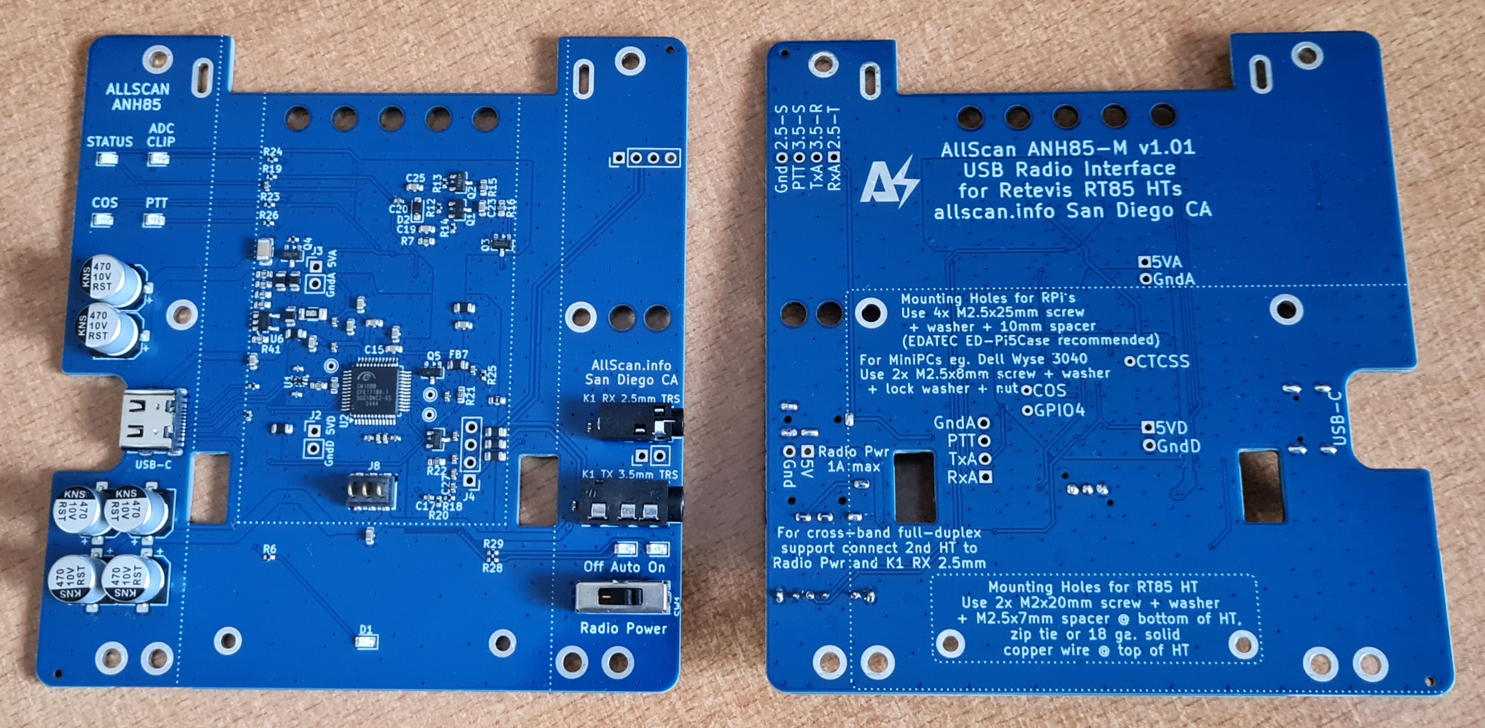 Designed for Retevis RT85 and equivalent HTs (Explorer QRZ-1, TYT TH-UV88), brings a new level cost-effectiveness to AllStar, integrating the URI142 electronics onto a mounting plate PCB, enabling nodes to be built in minutes with zero soldering. Outstanding audio quality equal to the URI142 and ANF101, and far better than SHARI/Clearnode/SA818 hotspots, while being dual band VHF/UHF, providing 1, 2, or 2.5 Watts power output, fully supported with ASL, HamVOIP, DVSwitch, EchoLink, DigiPi and other apps, with simple front-panel configurability on the HT LCD and keypad. 3.5" x 3.8" (90x96mm). SchematicANH85-M - $59