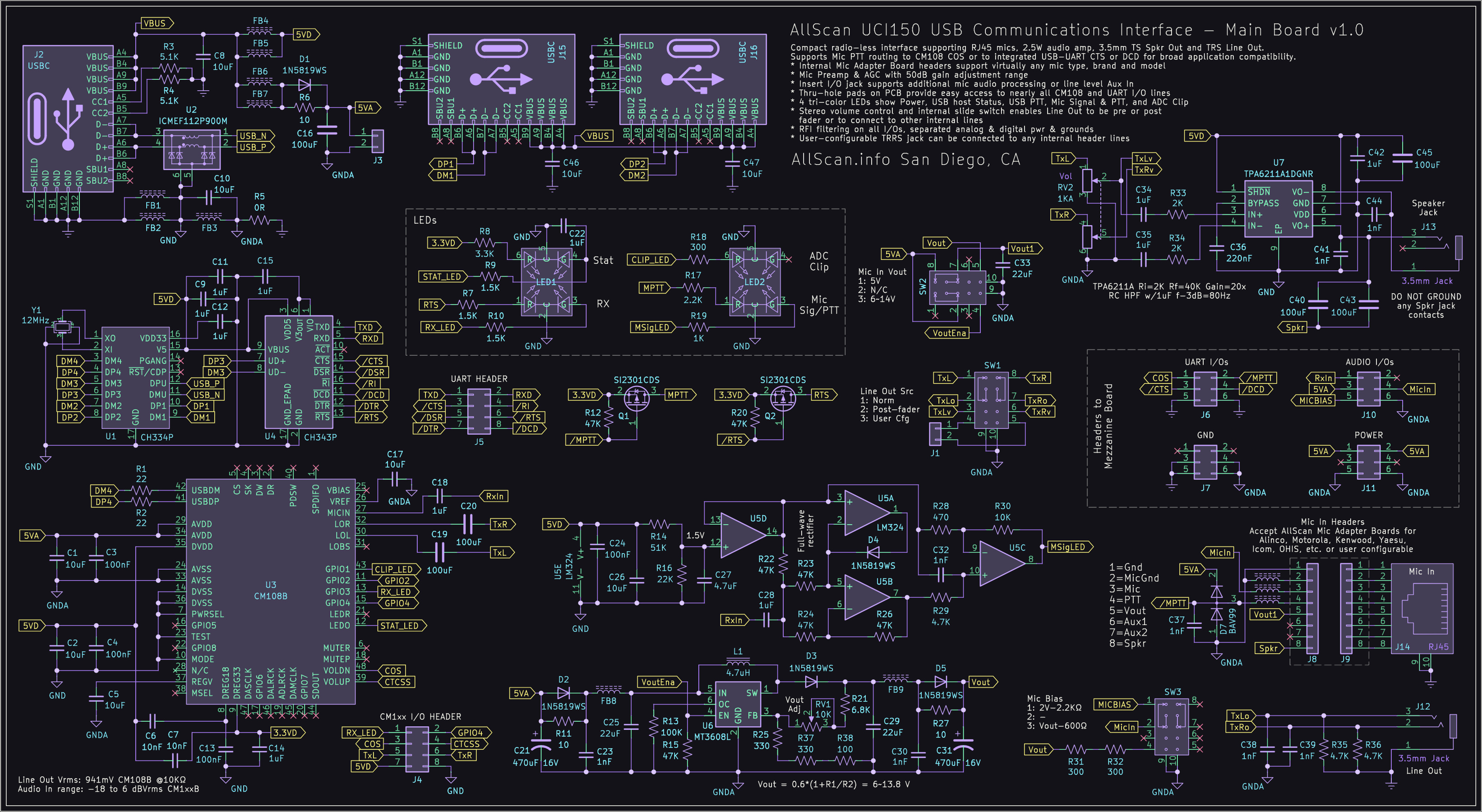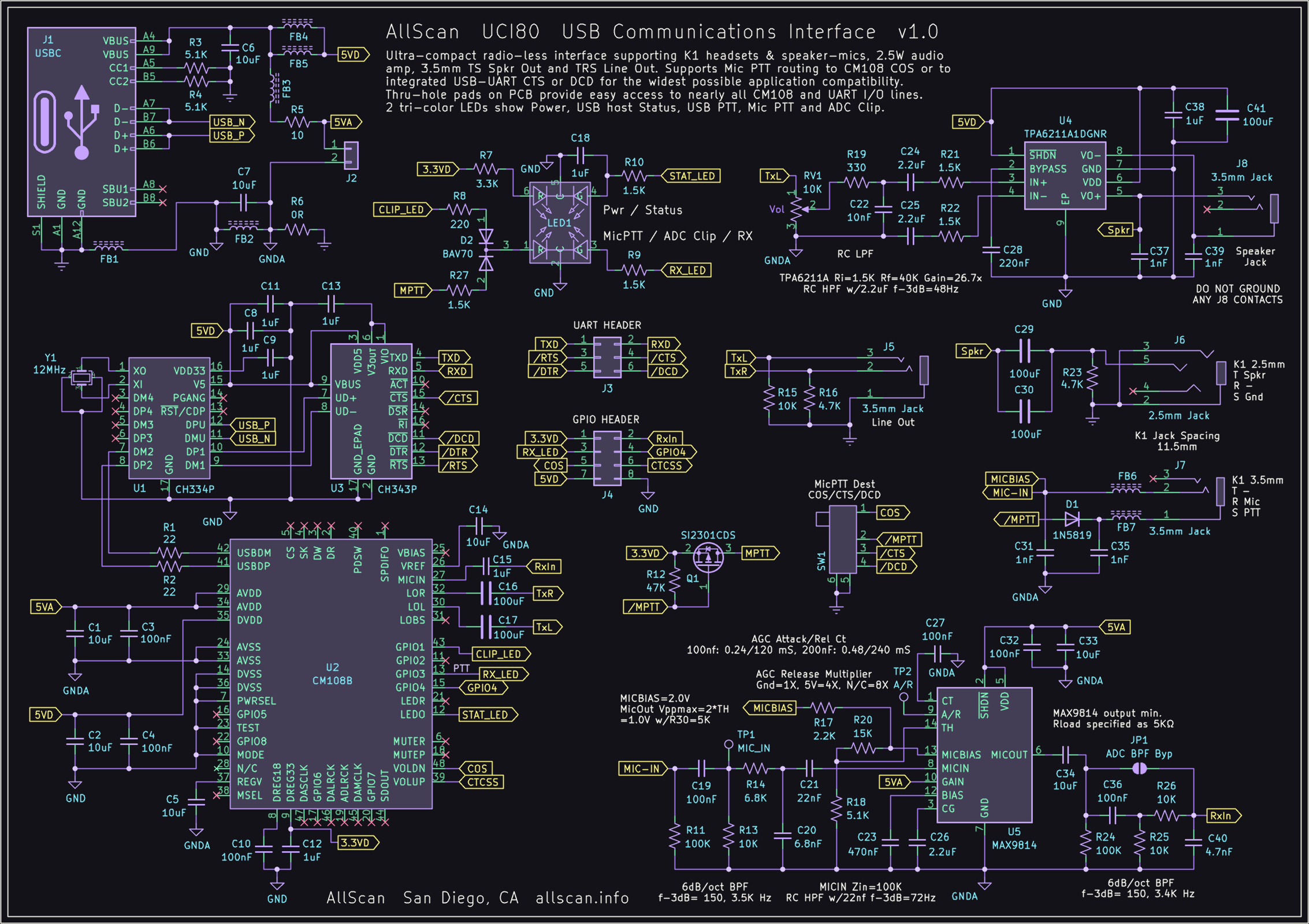 AllScan URIs provide the most comprehensive RFI/EMI filtering available, with separate USB/Digital/Analog ground planes and power lines, ferrite beads and bypass caps on all I/Os, and RC filters on the Analog supply. The URI201 adds audio isolation transformers and switch-configuration options supporting various signal and grounding configurations. The URI125 PCB measures only ~2"x2" – not much larger than a CM108 sound fob but with far superior RFI/EMI-rejection and with all I/O lines available on through-hole header pads. URIs can also be provided without an enclosure or cables at a discount, contact me for details.