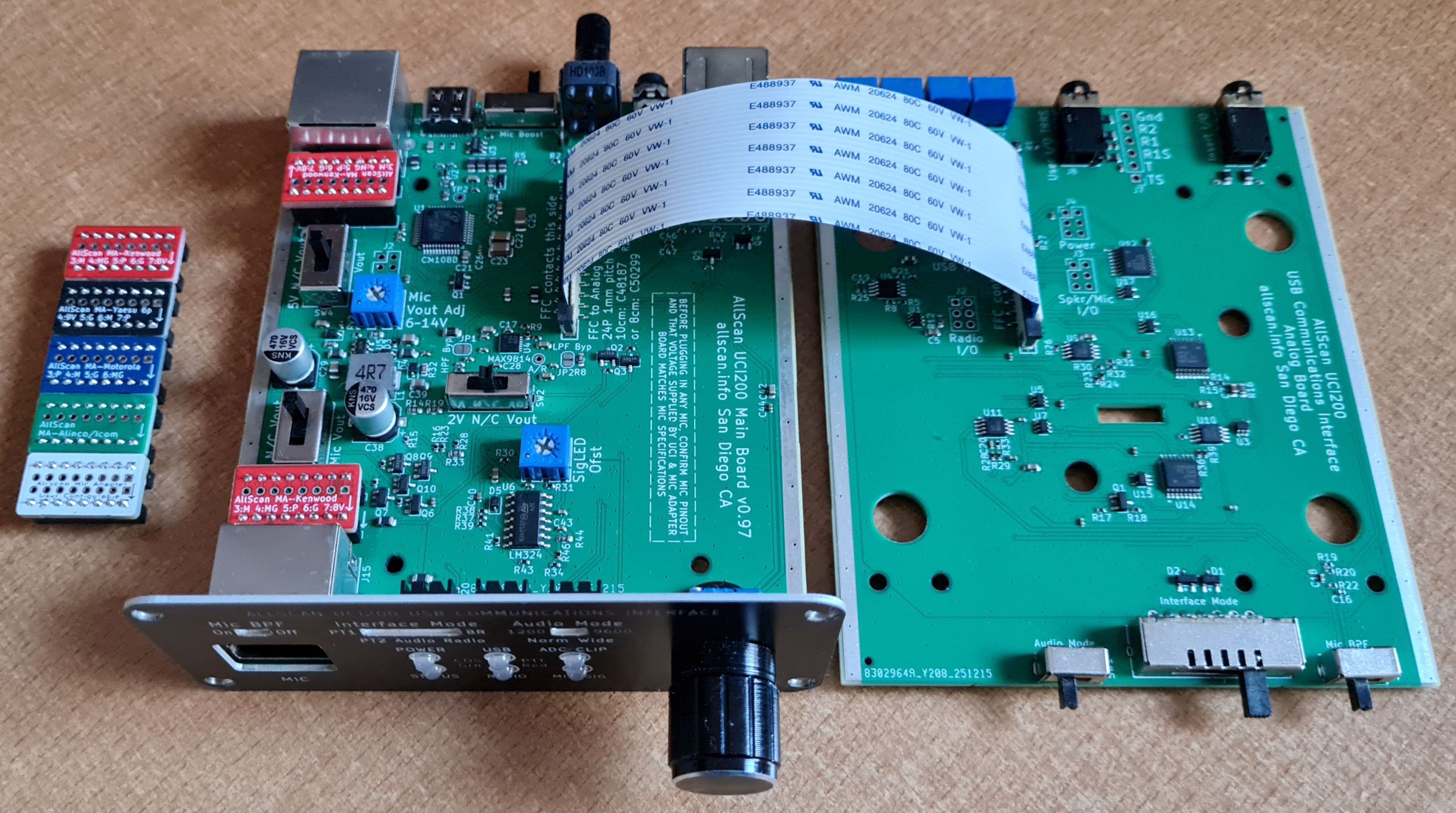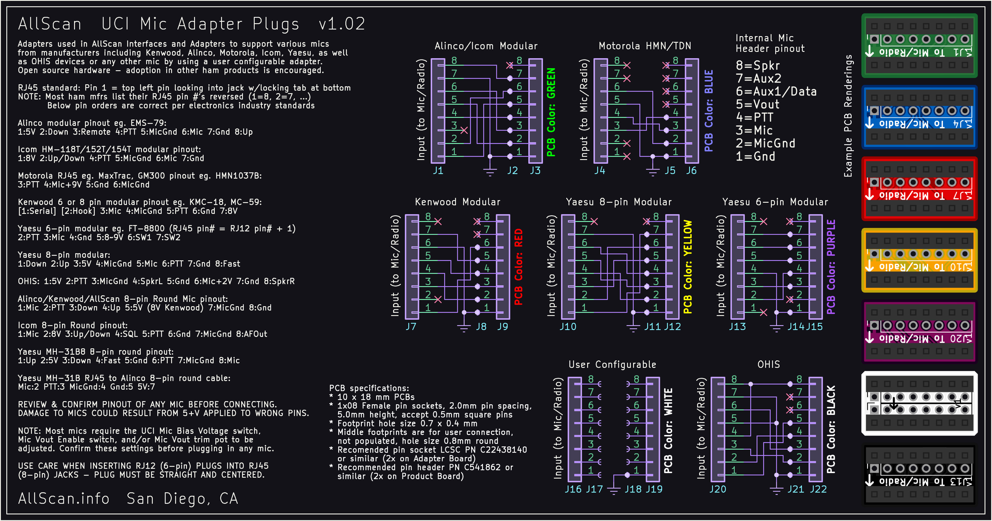 To fully support a wide range of mics and radios required yet another industry-leading innovation – the integration of the AllScan MA1 Mic Adapter into the UCI200, and creation of an open-source hardware standard for small 10×18mm adapter PCBs that allow literally any brand or model of communications mic to be plugged in, supplied with any DC Supply Voltage from 5-14V and/or any Mic Bias source from 2V/2KΩ to 5-14V/600Ω while also passing through button-press/serial data lines to a secondary RJ45 jack that connects to the radio's mic jack such that the mic keypad functions can be used as normal with the radio to enter frequencies, select channels or send DTMF tones.