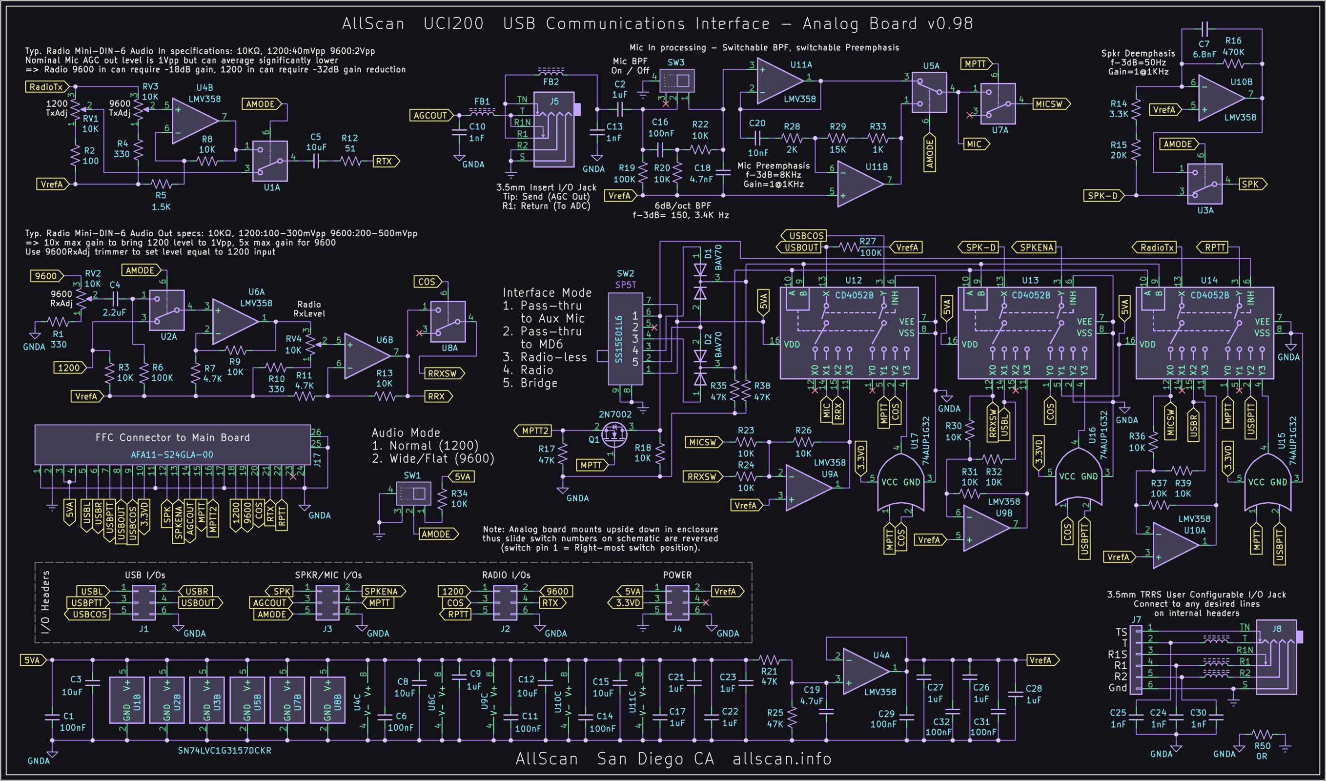 Because the UCI200 supports the use of radios with a Mini-DIN jack – which have both "1200" (Speaker) and "9600" (Preemphasized, Flat) audio I/Os, and because the UCI200 is the first product that enables a mic signal to be directly routed to a Mini-DIN jack (after being amplified, filtered and limited), this implied it should also support selectable mic preemphasis and speaker audio deemphasis. Not everyone uses the 9600 I/Os but because AllStar does support preemphasized audio, it would have limited AllStar's functionality if the UCI200 only supported the 1200 I/Os.