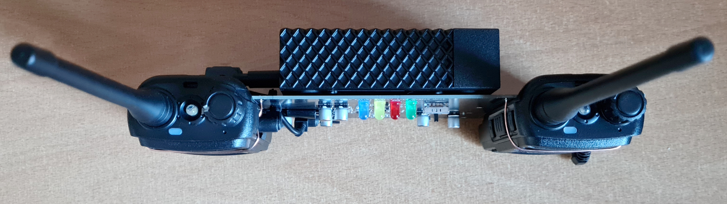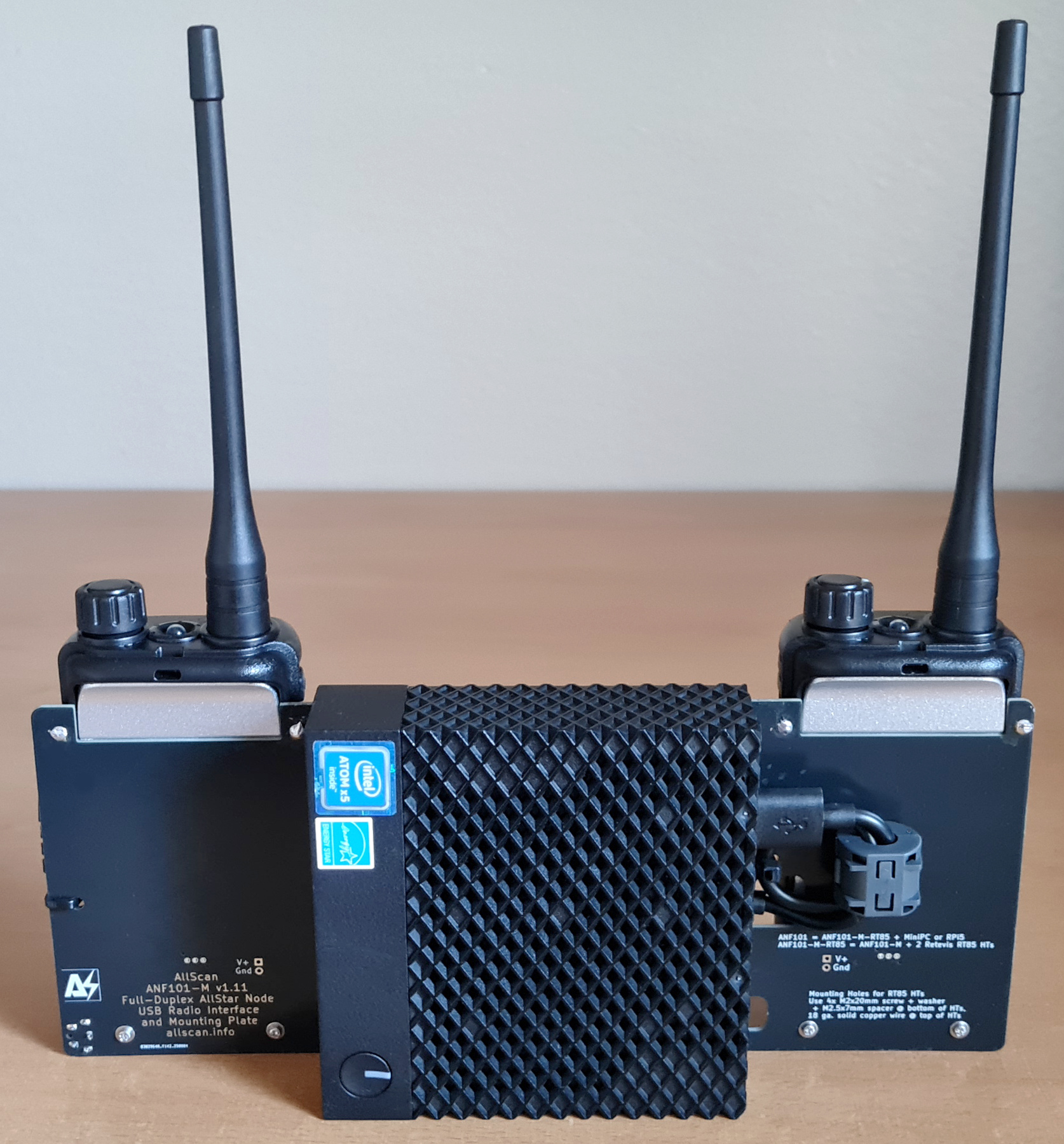 Clear visibility of the MiniPC, HTs, and radio interface is important. Sometimes things happen on AllStar such as disconnects or timeouts and it's nice to be able to look at the node and be able to see the HT LCDs, LEDs and URI LEDs. Use of a mounting plate rather than an enclosure provides easy access to everything.