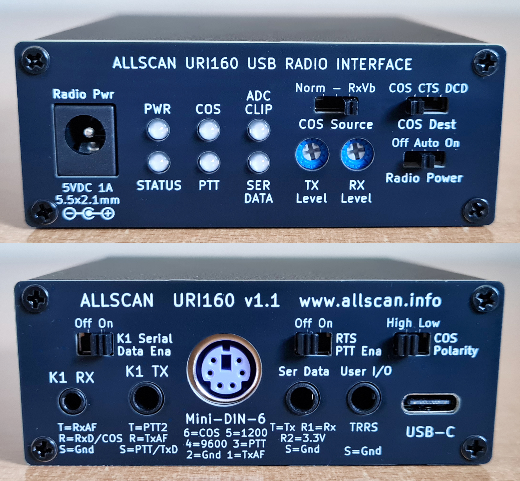AllScan URIs provide outstanding audio quality, RFI-rejection and cost-effectiveness, and support AllStar, EchoLink, VARA FM, Winlink, DigiPi, APRS, DireWolf, FT8, other PTT/data communications applications and interfacing of Win/Mac/Linux PCs and Smartphones to HTs, portable and mobile radios for use with remote rig control, digital modes, packet radio, etc. Comprehensive LEDs show USB host Status, COS, ADC Clip, and PTT state. HTs connect with standard K1 2.5mm & 3.5mm TRS cables, the URI125, 160 and 201 have a Mini-DIN-6 jack, and the URI201 provides a DB9 jack. AllScan URI Configuration Settings