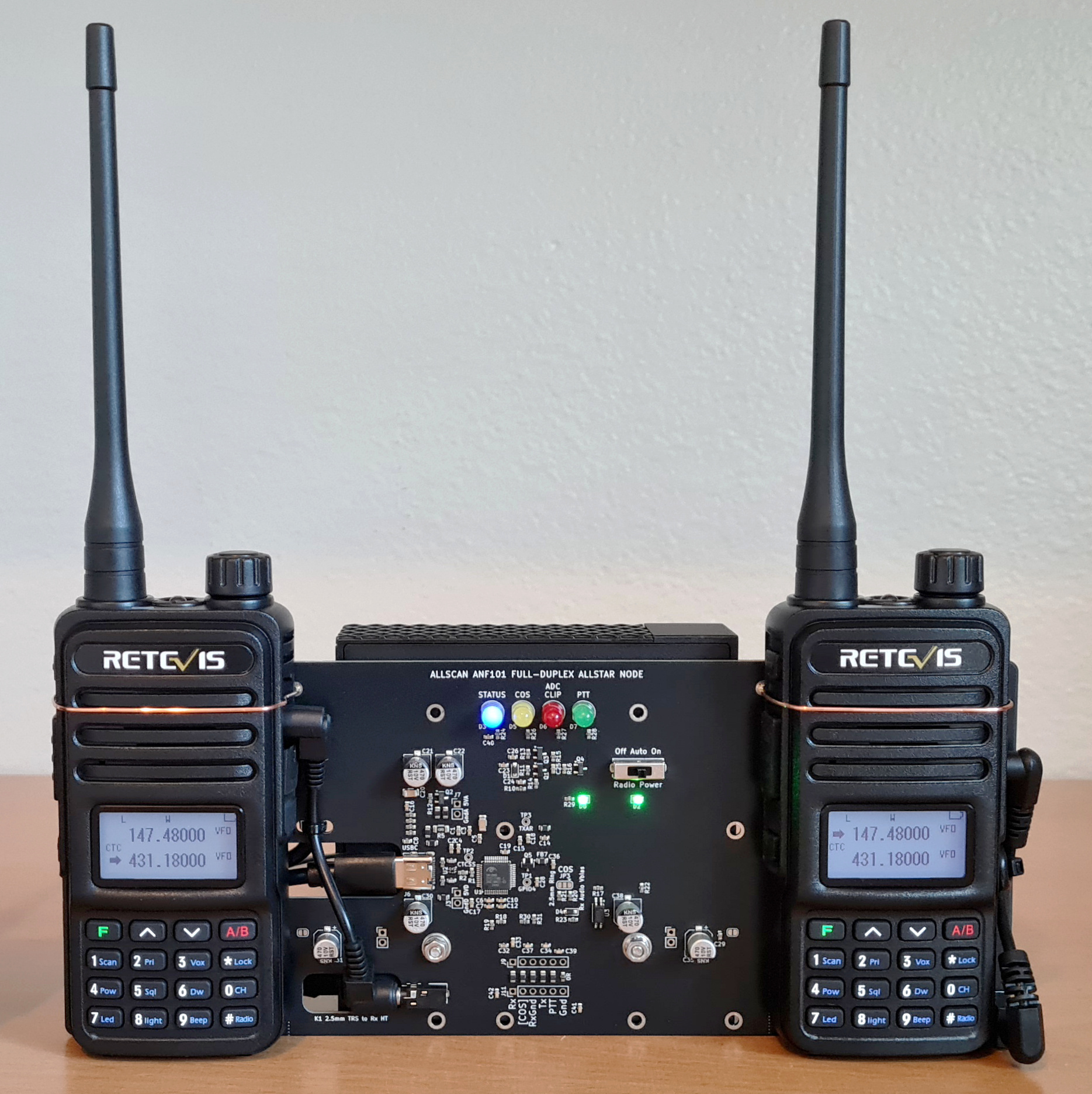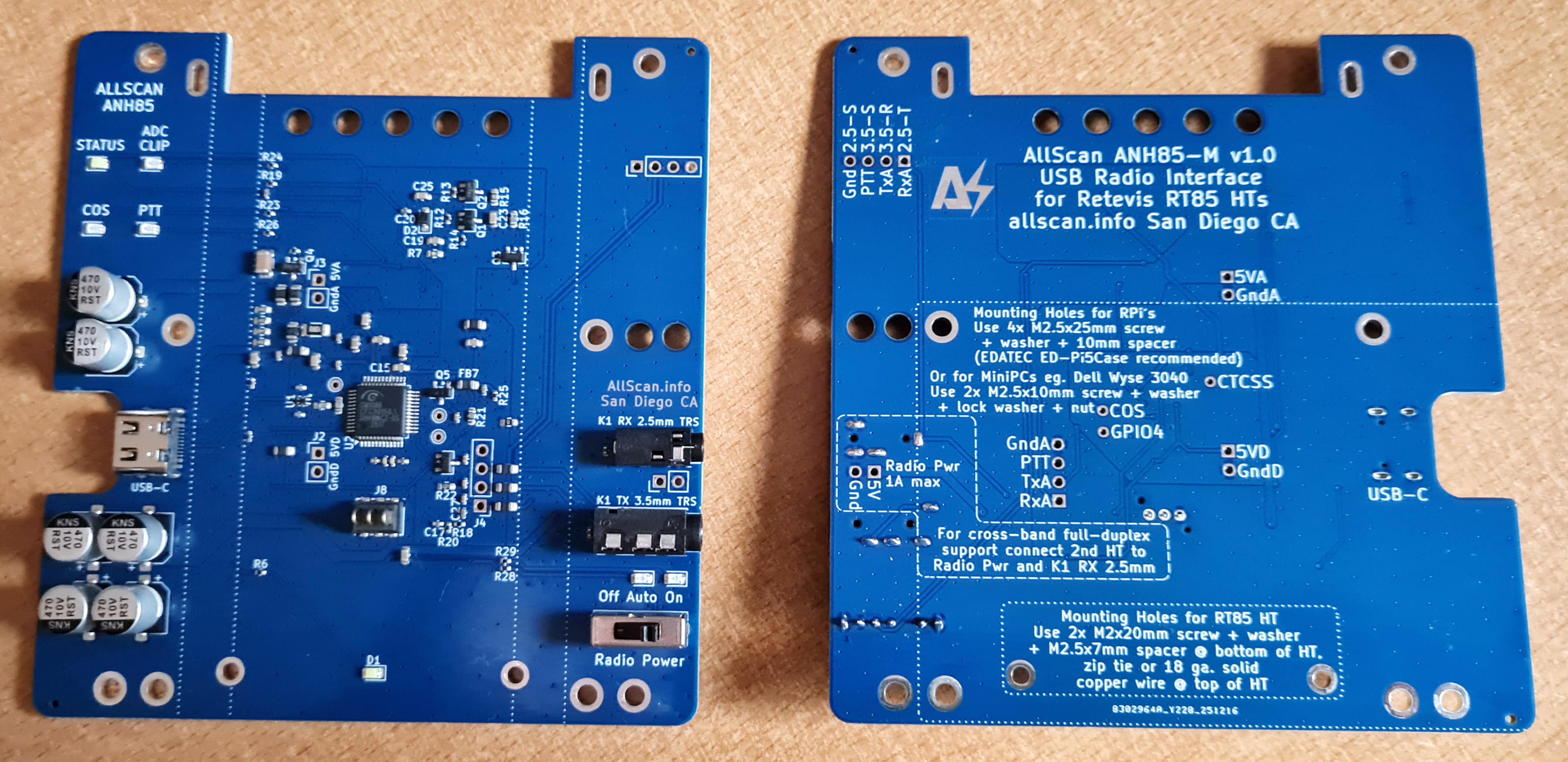Designed for Retevis RT85 and equivalent HTs (Explorer QRZ-1, TYT TH-UV88), provides 5V 1A HT power output, supports automatic COS+CTCSS detection from speaker amp bias voltage, and brings a new level cost-effectiveness to AllStar, integrating the URI142 electronics onto a mounting plate PCB, enabling nodes to be built in minutes with zero soldering. Mounting hardware is included for the HT. Outstanding audio quality equal to that of the URI142 and ANF101, and far better than SHARI nodes, Clearnodes and SA818-based Pi-hats/hotspots, while also being dual band VHF/UHF, providing 1, 2, or 2.5 Watts power output, fully supported with ASL, HamVOIP, DVSwitch, EchoLink, DigiPi and other apps, with simple front-panel configurability on the HT LCD and keypad. SchematicANH85-M - $59