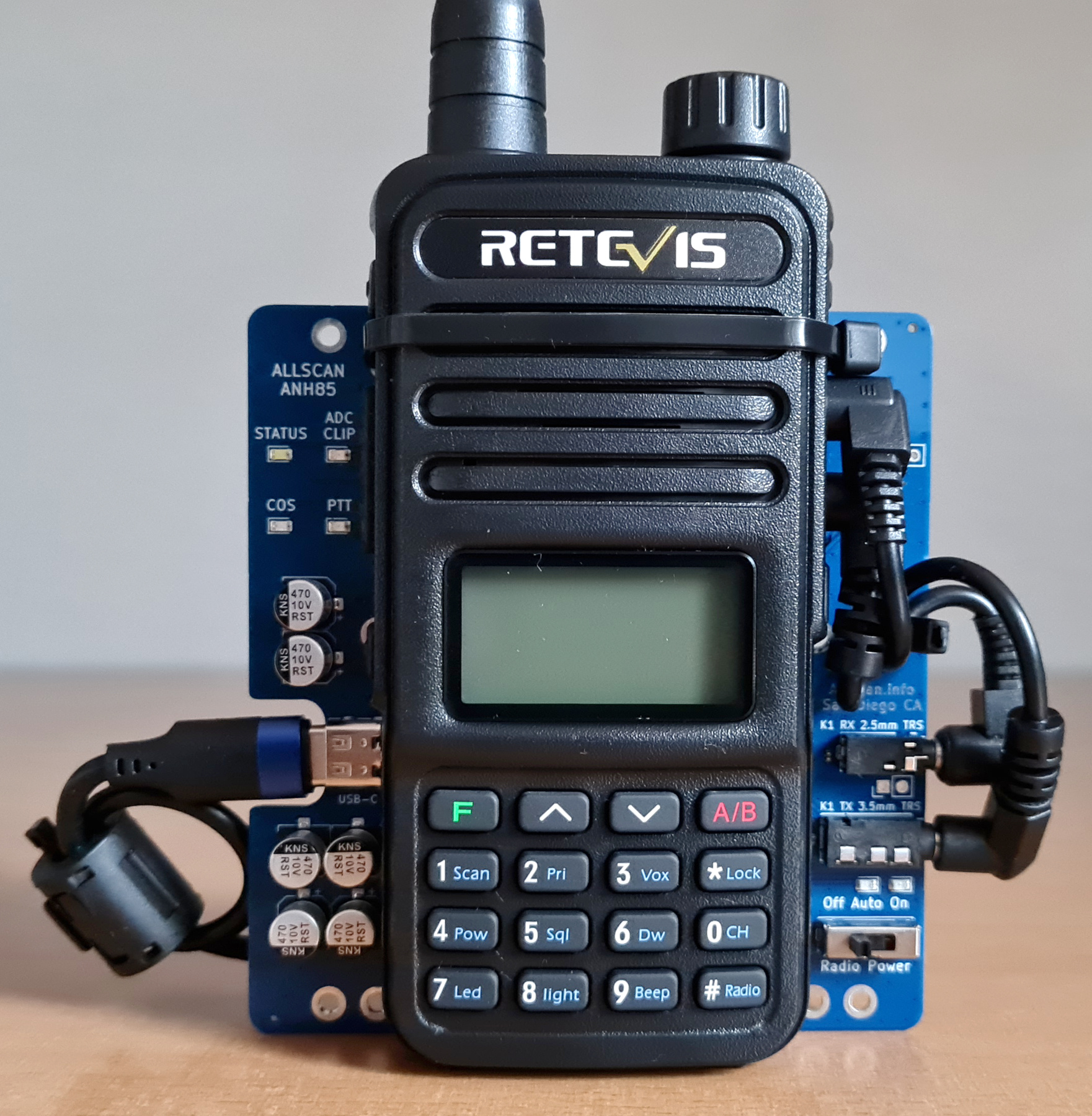AllScan URIs with K1 jacks support detection of DC bias voltage present on the speaker audio line of RT85 and many other HTs when a signal with valid CTCSS tone is present. To confirm if an HT you have will support this, check the DC voltage on the 2.5mm jack (Tip=RxAudio, Sleeve=Gnd) with a voltmeter - if ≥1VDC when a valid signal is present it will be compatible. AllScan URIs that provide a 5V radio power output will support Retevis RT85's and similar models from Baofeng, RadTel, TYT, etc., but some models (typically those with color LCDs) will not Tx on 5V. To confirm if an HT you have will Tx on 5V just connect it to a 5VDC power source and see if it turns on and transmits OK. If not the URI145 can be used which can provide 5-9V.
