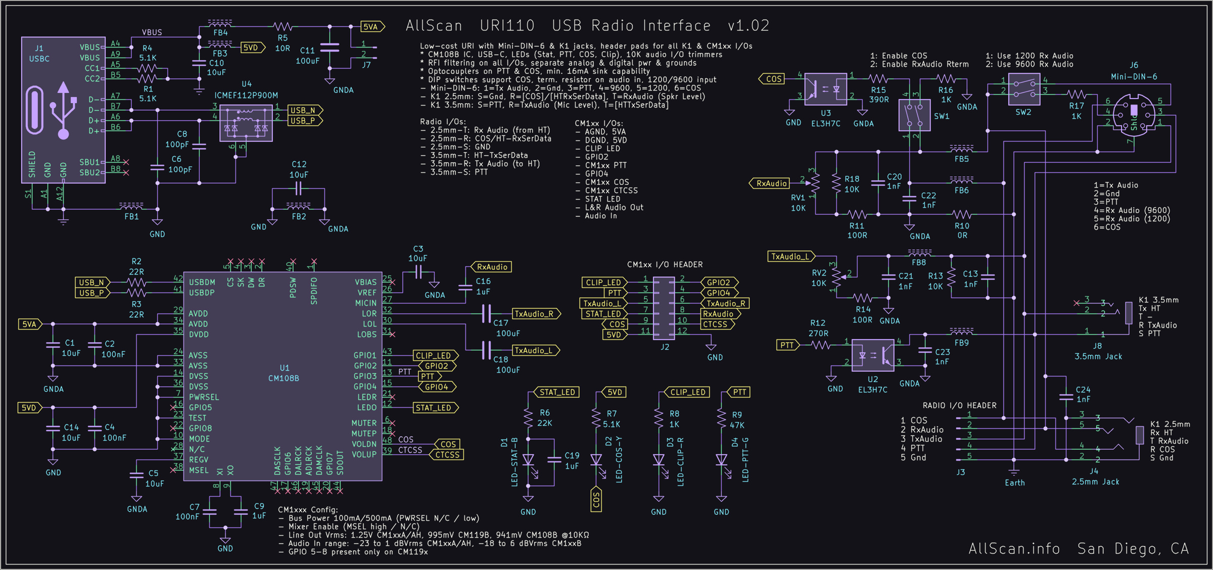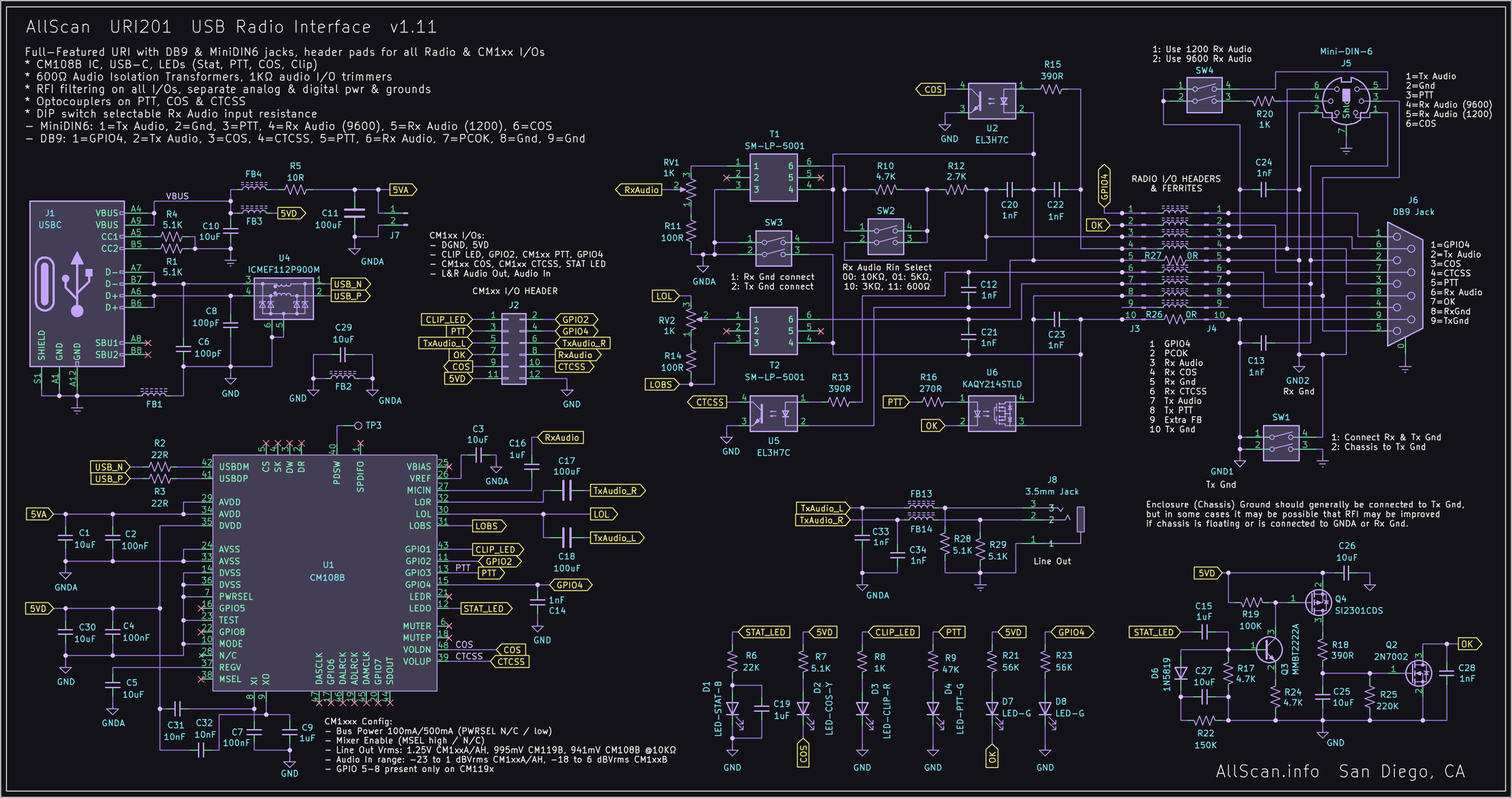 Perfect for use with AllScan node designs or with nearly any type of radio(s). AllScan URIs provide the most comprehensive RFI/EMI filtering available, with separate USB/Digital/Analog ground planes and power lines, ferrite beads and bypass caps on all I/Os, optocouplers on PTT & COS lines, and RC filters on the Analog supply. The URI201 adds audio isolation transformers and switch-configuration options supporting various signal and grounding configurations. The URI101/110 PCB measures only ~2"x2" – not much larger than a CM108 sound fob but with far superior RFI/EMI-rejection and with all I/O lines available on through-hole header pads. The URI110, URI145 and URI201 support a max output level of 3Vpp.