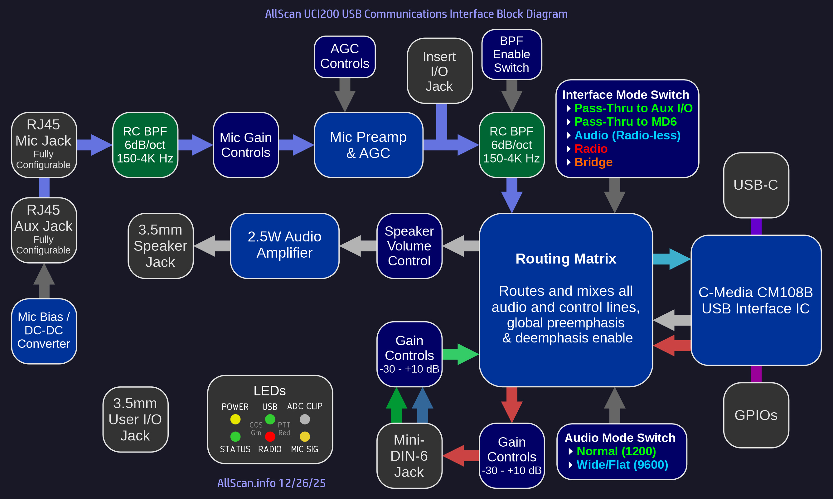 Because the UCI200 supports the use of radios with a Mini-DIN jack – which have both "1200" (Speaker) and "9600" (Preemphasized, Flat) audio I/Os, and because the UCI200 is the first product that enables a mic signal to be directly routed to a Mini-DIN jack (after being amplified, filtered and limited), this implied it should also support selectable mic preemphasis and speaker audio deemphasis. Not everyone uses the 9600 I/Os but because AllStar does support preemphasized audio, it would have limited AllStar's functionality if the UCI200 only supported the 1200 I/Os.