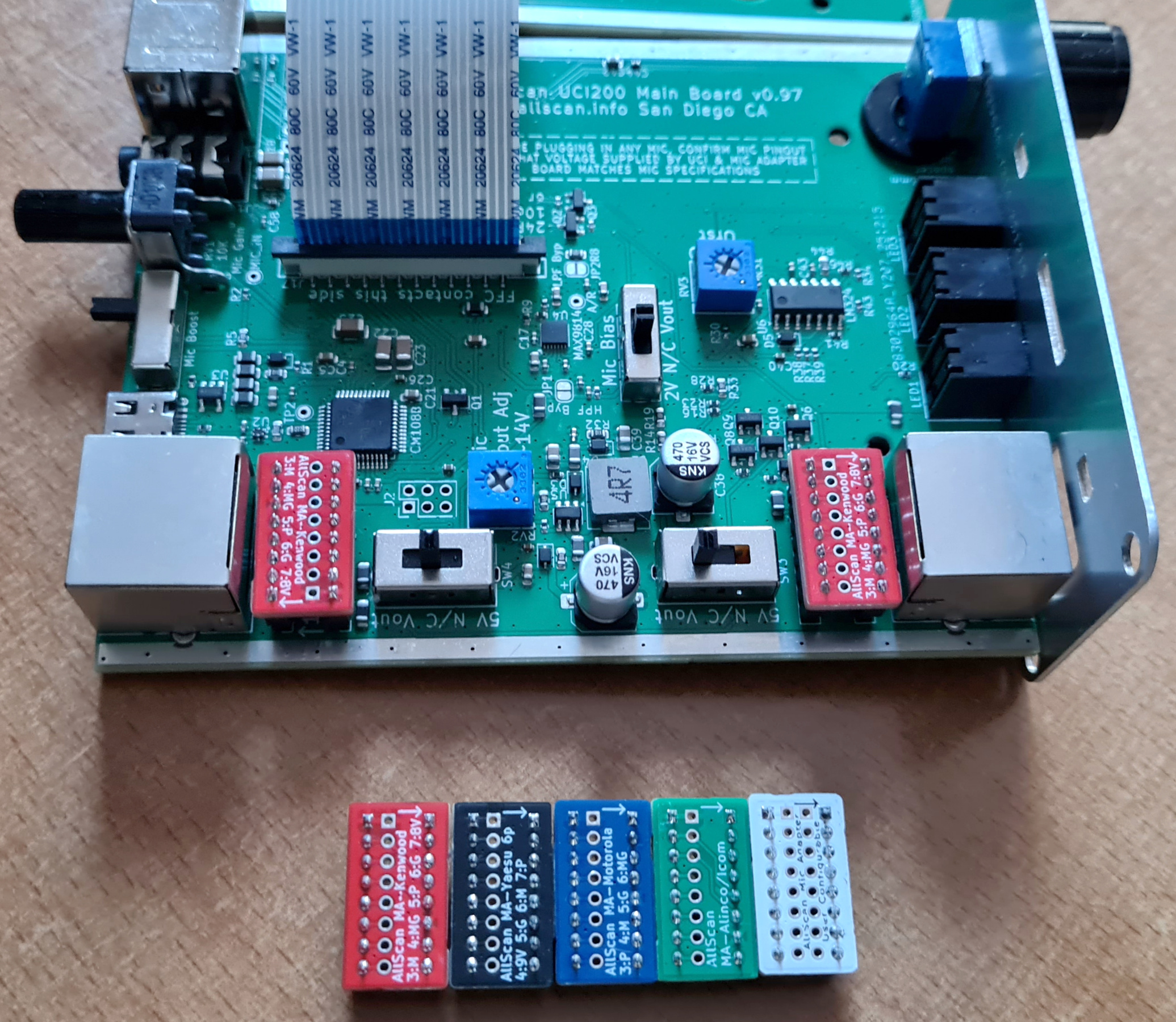 Shown below are the UCI200 internal PC boards along with various Mic Adapter boards. This unit is configured for use with a Kenwood TM-V71A, which requires the red MA-Kenwood mic adapter PCBs to be inserted into the headers behind each RJ45 jack, the Mic supply voltage to be set to 8V for the front mic jack and N/C for the back mic jack, and Mic Bias off.